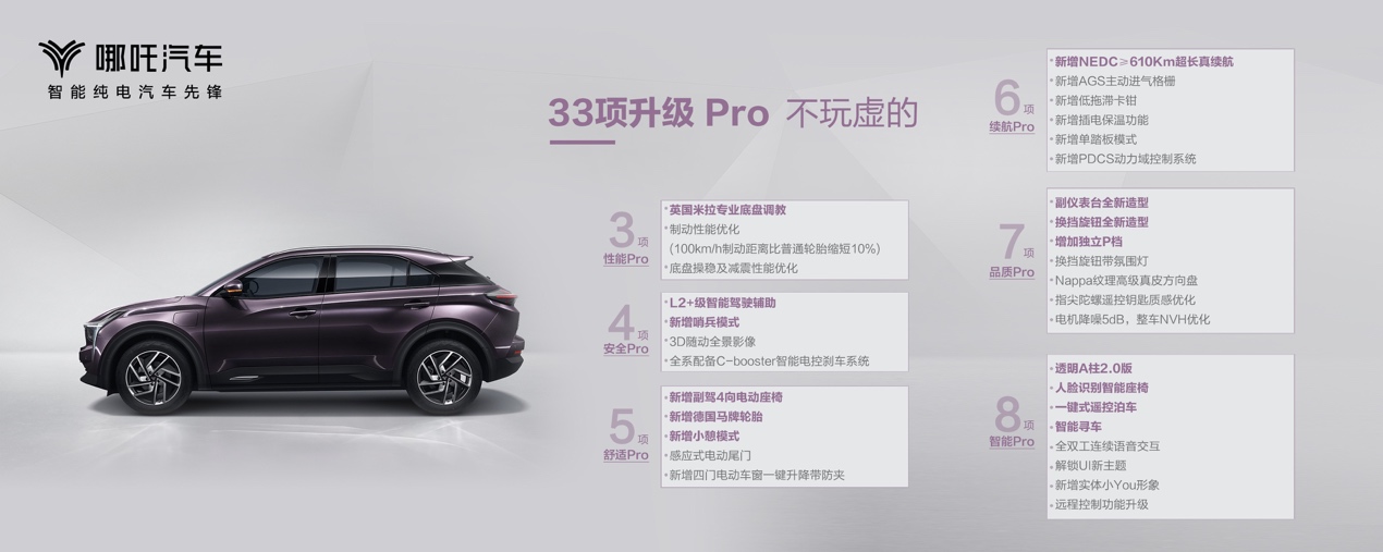 哪吒U Pro在性能、安全、舒适、品质、续航、智能六个方面进行了33项的升级。包括新增了综合工况续航里程(NEDC)高达610Km的610 探火版,由英国米拉进行了专业底盘调教、对制动性能进行了优化、新增一键遥控泊车、哨兵模式、智能寻车等功能配置,并对外观和内饰进行了细节调整,进一步提升品质感。