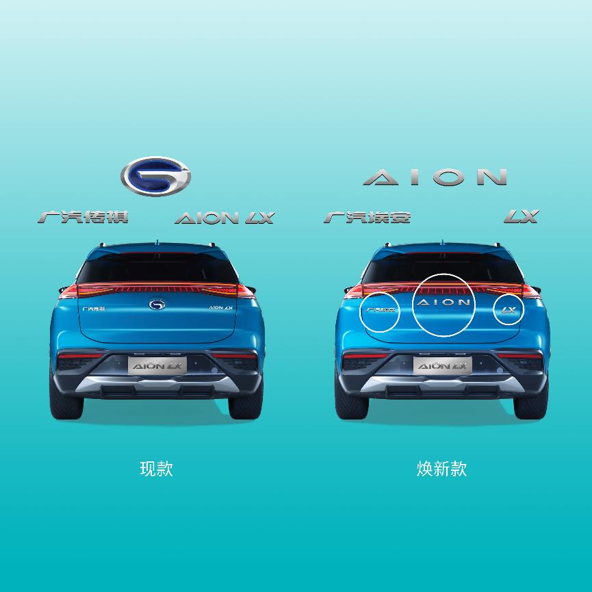 焕新后的AION 车型标识,最大的变化在于品牌名称由“广汽传祺”变成了“广汽埃安”,以此宣示埃安的品牌独立。