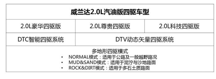 那么汽油版的2种四驱系统该如何选呢?如果想花最少的钱,拥有比两驱车型更好通过性和操控性,DTC智能四驱系统较为合适。如果对车辆通过性能和操控性能都有较高要求,那搭载DTV动态矢量四驱系统的威兰达就是你的不二之选,跃级的四驱表现,物超所值。