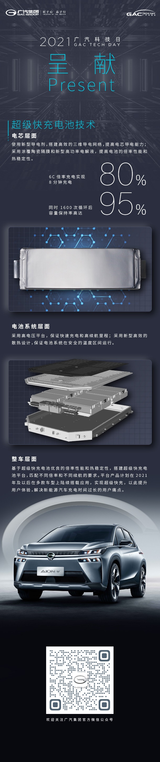 无科技、不广汽。广汽集团从2019年开始提出向科技型企业转型,以科技驱动创新,紧抓国企改革“双百行动”机遇,培育快速创新、勇于创新、持续创新的沃土,实现发展动力的变革。广州巨湾技研有限公司是广汽集团国企改革“双百行动”中的混改试点,自成立以来,研发和产业化落地进展顺利,巨湾超级快充电芯及其PACK产品将于今年9月投产并搭载到广汽旗下电动汽车新车型,可实现5~8分钟充电80%,将给用户带来极致快速的充电体验。