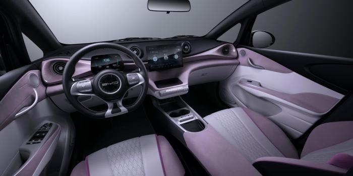 海豚的内饰大量采用柔美的曲线,如同流体一般自然和谐。连贯的线条以两侧前门板为起止点,贯穿整个仪表台,营造出环抱感。悬浮式仪表台形态轻盈,仿佛在水面飞翔,同时具有清晰的层次感。三辐式运动方向盘造型饱满,仪表则展现出简约的数字科技风。自适应旋转悬浮Pad是内饰前部的视觉核心,拥有海豚专属的UI设计。