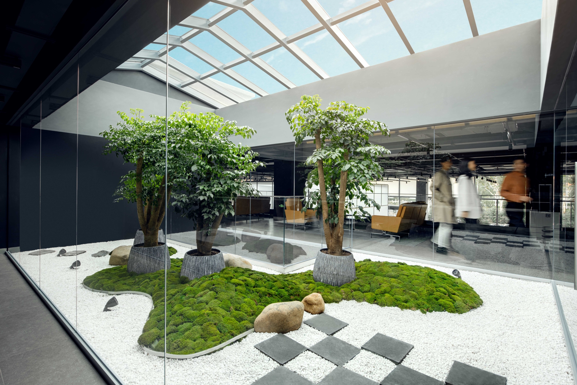 展厅入口处矗立着的立方体结构正是个性定制魔方(Brand Cube),大胆采用半透明材质和开放式底部设计,这里是供自由选配车辆内外饰细节的专属场所。在展厅中庭,生机盎然的绿植与倾泻而下的阳光相映成趣,为极简主义的空间增添了一份暖意和自然美韵。