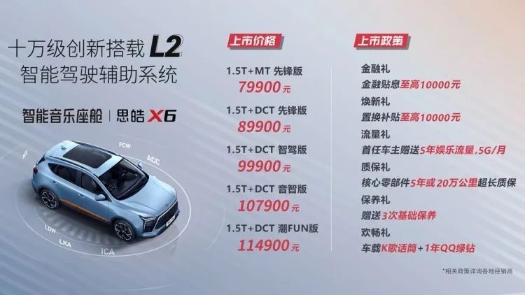 思皓X6共5款车型,官方指导价7.99-11.49万元,7月31日前下订,可享受金融贴息至高10000元、置换补贴至高10000元、首任车主5年娱乐流量(5G/月)、核心零部件5年或20万公里超长质保、基础保养和欢畅礼包等大礼。
